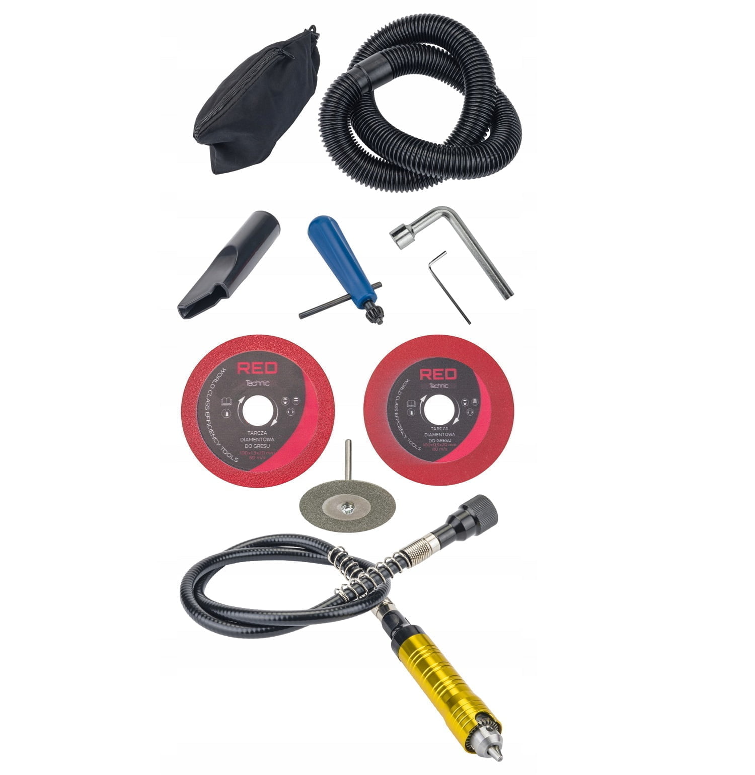 - Mini brusilnik – opremljen z gibljivo gredjo z možnostjo pritrditve kamnov ali brusilnih plošč za mletje ali izrezovanje ostankov fug na težko dostopnih mestih. Po demontaži velike rezalne plošče 100 mm lahko na napravo pritrdite gred z vpeto vpenjalno glavo s pomočjo vrtalnega ključa, ki je na voljo v kompletu.