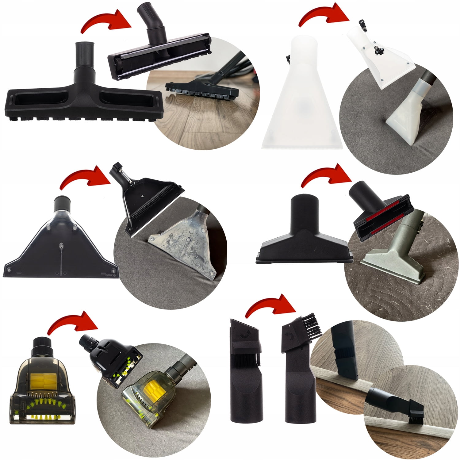 - Priloženi dodatki: Vključuje različne nastavke za čiščenje tal, preprog, oblazinjenja in težko dostopnih mest.