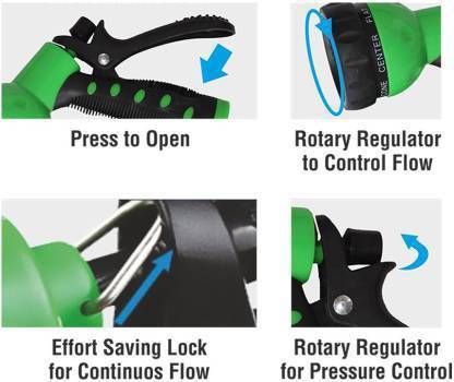 Z ročico za prilagoditev lahko hitro preklapljate med različnimi načini pršenja, s posebnim zatičem pa lahko izbrani način zaklenete, s čimer se lahko izognete nepotrebnem utrujanju rok, še posebej pri daljši uporabi. Garnitura za zalivanje vključuje: nastavek za pipo 3/4″ in reducirnik 3/4″-1/2″, 2 avtomatični spojki, pršilna pištola.