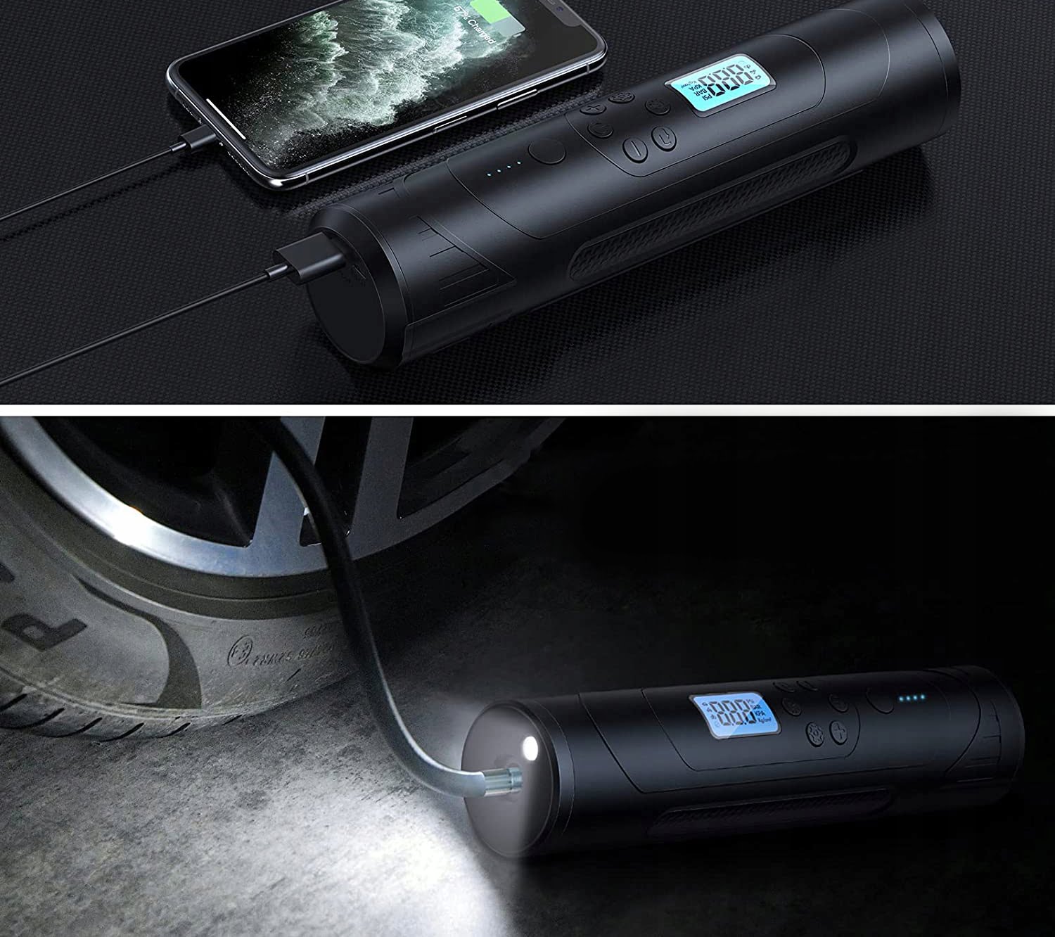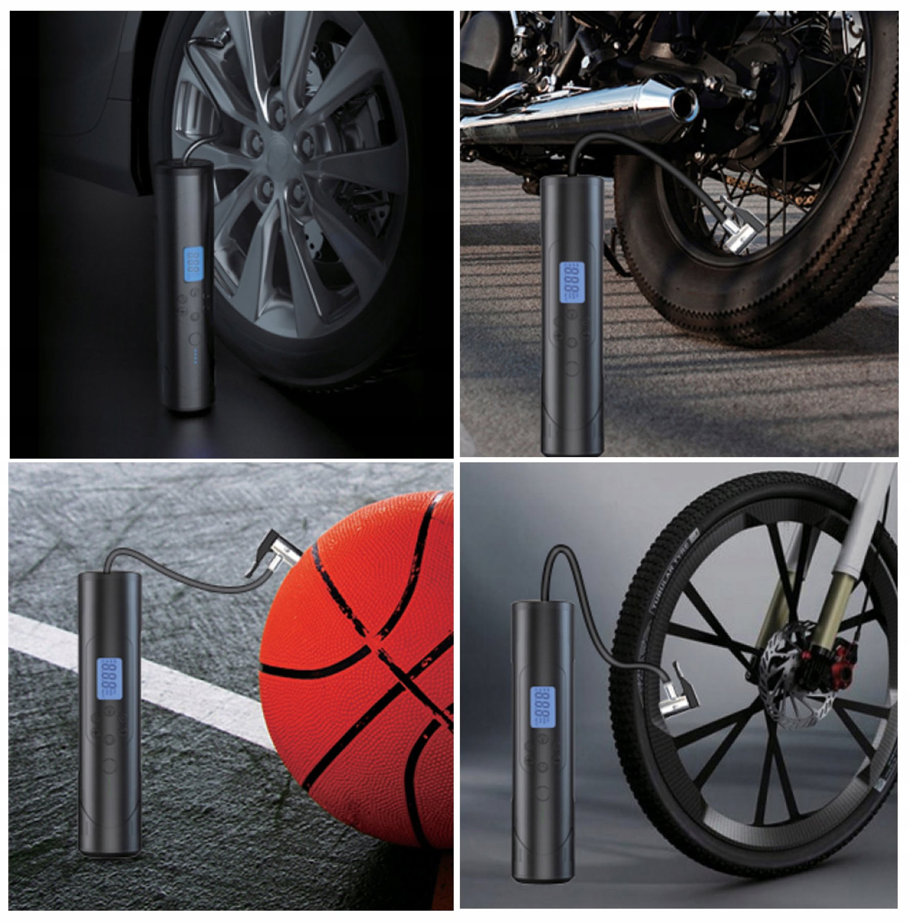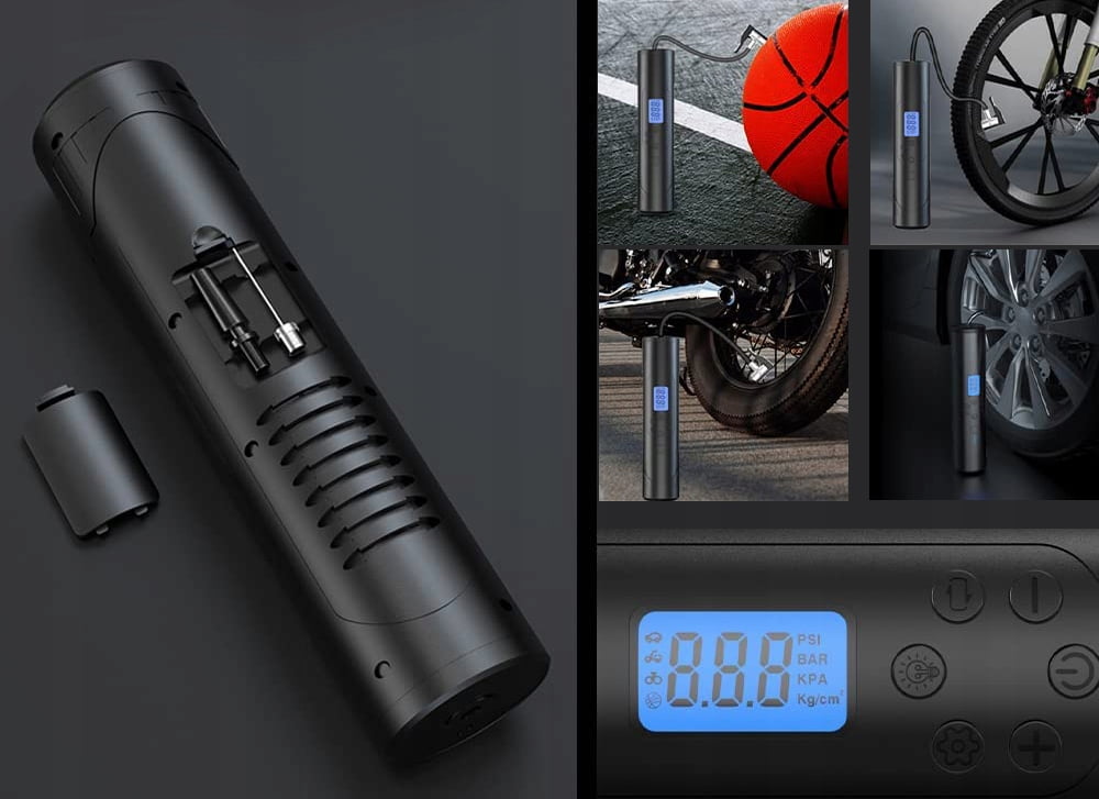 Zračni kompresor s funkcijo svetilke, ki ga napaja vgrajena baterija. Namen uporabe: napihovanje avtomobilskih gum, kolesarskih gum, žog, vzmetnic itd.