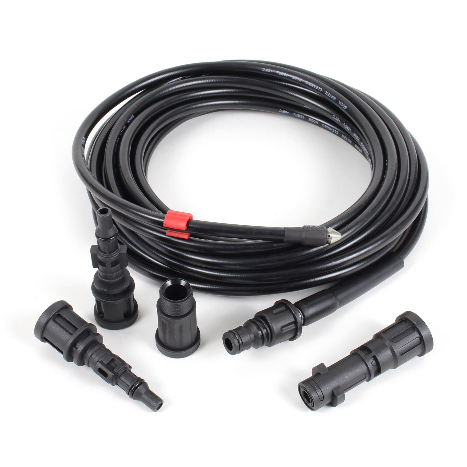 Cev je opremljena s štirimi različnimi adapterji, kar zagotavlja njeno združljivost z različnimi vrstami visokotlačnih čistilnikov. Izdelana je iz trpežnih materialov, ki so odporni na obrabo in zagotavljajo dolgo življenjsko dobo. Fleksibilnost cevi omogoča enostavno manevriranje skozi zapletena cevna omrežja in težko dostopna mesta.