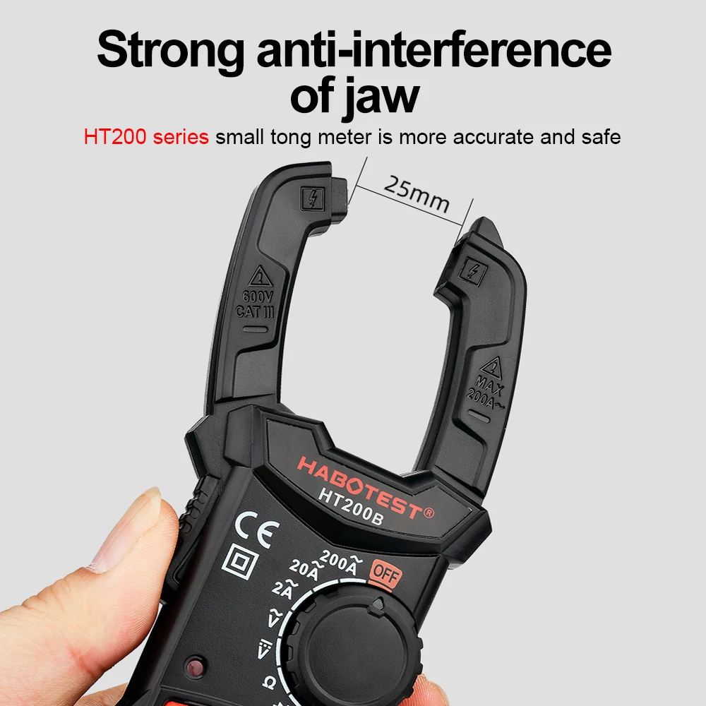 Kompaktne klešče HT200B omogočajo natančno merjenje različnih parametrov. Opremljen je z osvetljenim HD zaslonom in čeljustmi, katerih velikost je do 18 mm. Kljub svoji majhnosti navdušuje s funkcionalnostjo. Za napajanje potrebuje 2 AAA 1,5 V bateriji, ki ju je treba kupiti posebej – nista priloženi v kompletu.
