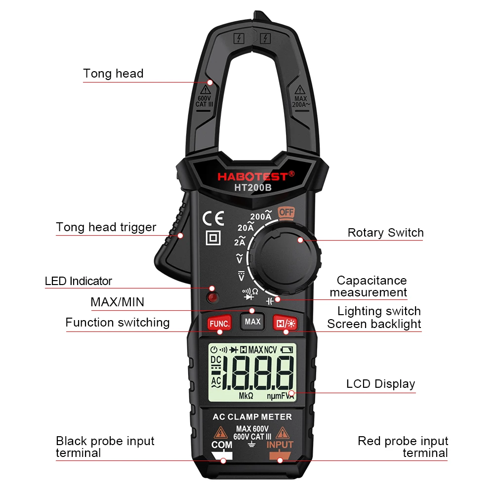 Digitalna tokovna merilna klešča LCD multimeter HT200B je opremljena z napredno tehnologijo, ki omogoča natančno merjenje električnih tokov. S svojim jasnim in preglednim LCD zaslonom vam omogoča enostavno branje meritev. Poleg tega je opremljena z intuitivnimi kontrolnimi gumbi, ki omogočajo enostavno upravljanje in navigacijo po meniju.