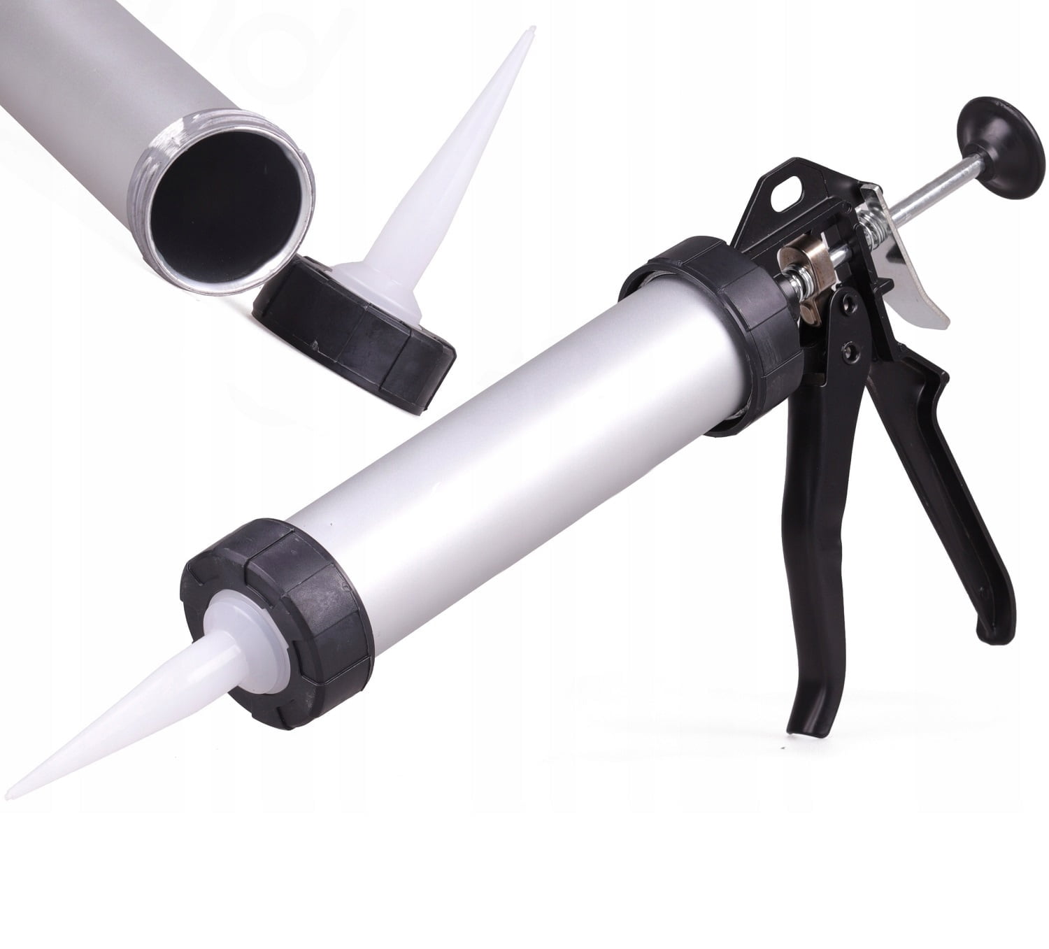 - Pištola za ekstrudiranje kita z aluminijastim cilindričnim ohišjem.