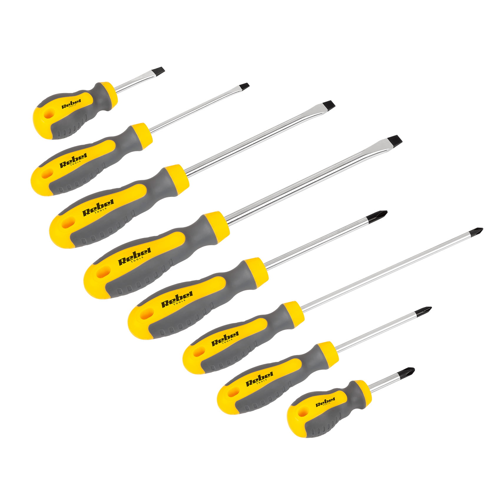 Rebel Tools ponuja komplet 8 izvijačev, ki so popolni za vsako delavnico. Vsestranskost te kombinacije poudarjata dve vrsti izvijačev: ploščati in križni. Zahvaljujoč ergonomskemu ročaju se izvijači Rebel Tools popolnoma prilegajo vaši roki, zahvaljujoč krom-vanadijevemu jeklu, odpornemu na korozijo in rjo, pa vam bodo služili res dolgo.
