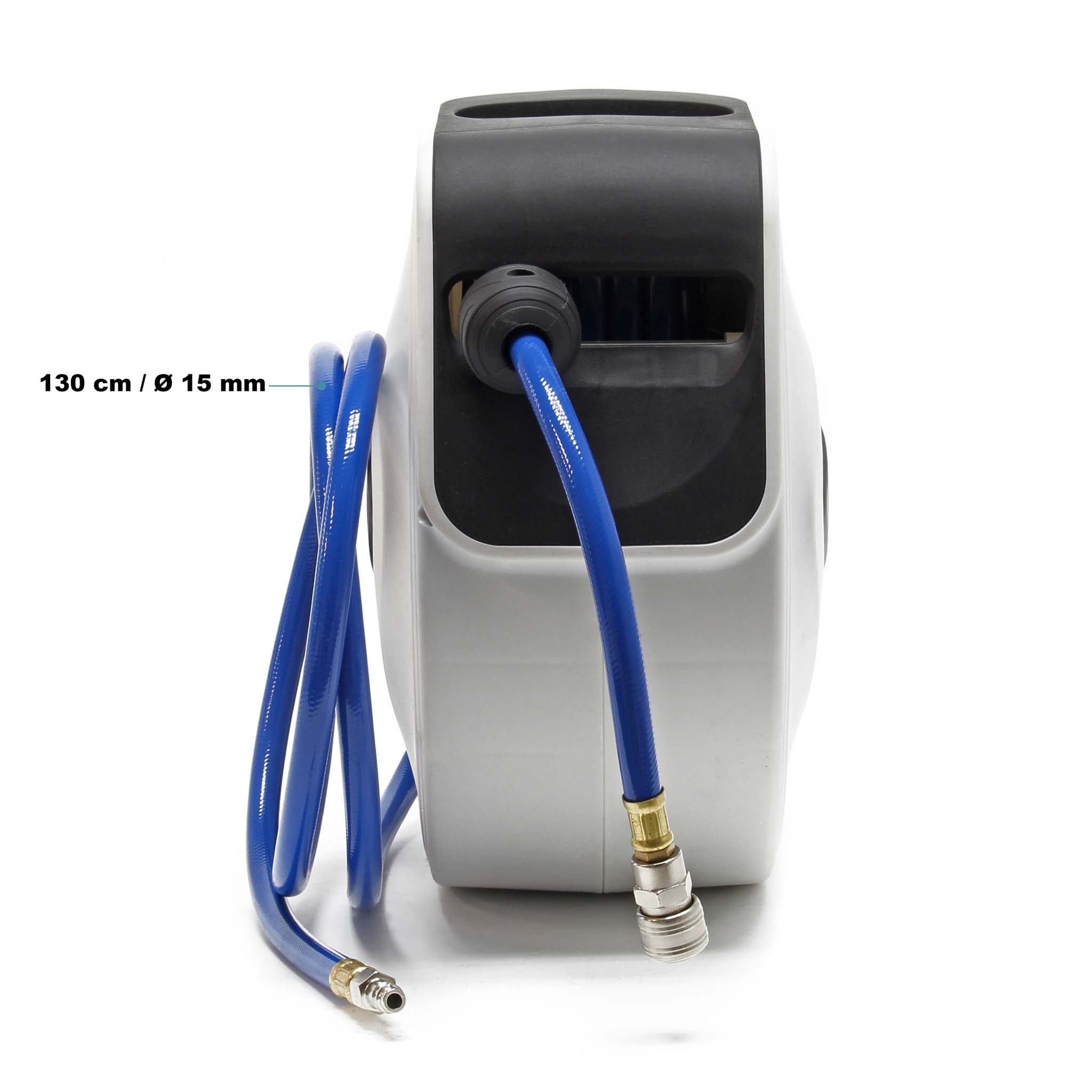 Kolut ima mehanizem samodejnega zaviranja, ki ga lahko odklenete, ko se rahlo povlečete nazaj. Sama odprtina cevi se lahko zasuka na stran, tako da se PVC tlačna cev lahko prožno uporablja v različnih smereh.
