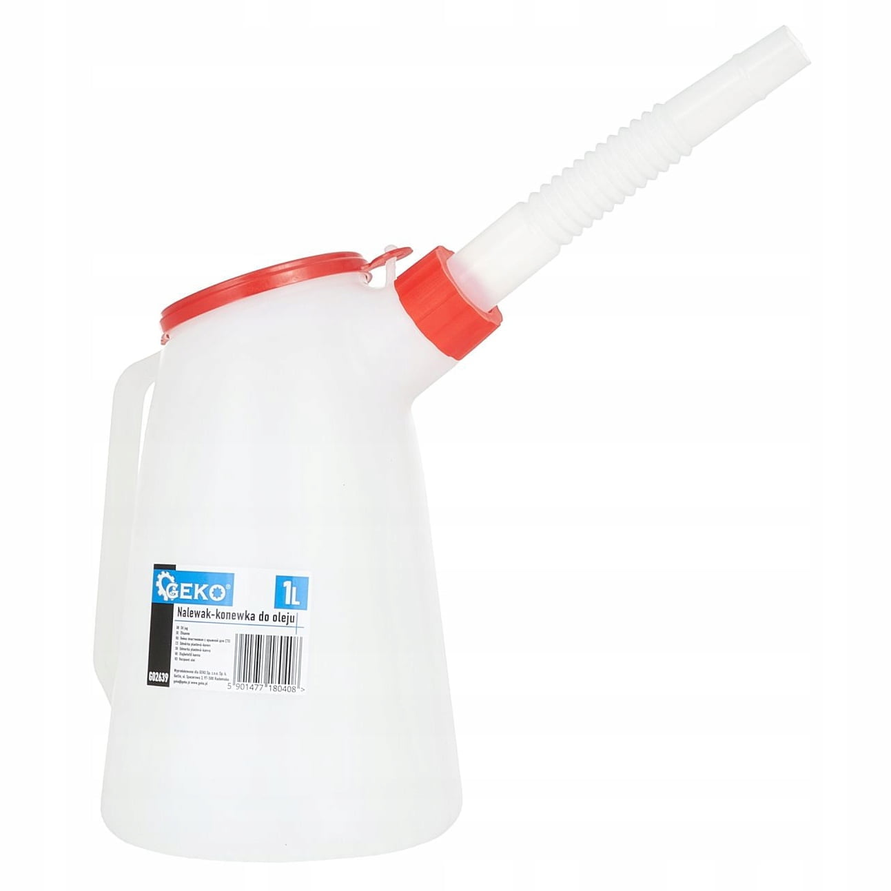 Plastična zalivalka za olje z lijakom prostornine 1L, namenjena predvsem za tovorna in kmetijska vozila, pa tudi za osebna vozila in vsakodnevno uporabo v vrtnarstvu.