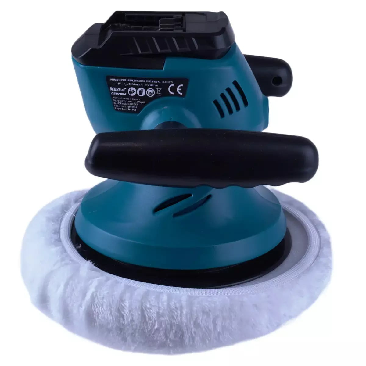 Polirka je nepogrešljivo orodje vsakega avtomehanika, slikopleskarja ali restavratorja. Polirni stroji so uporabni tudi v primerih, ko želite osvežiti površino kovine, npr. pri poliranju jeklenih delovnih površin ali elementov iz nar avnega kamna, kot so stopnice, tla, okenske police itd. Ekscentrični rotacijski polirnik DEDRA DED7084 iz serije SAS+ALL se napaja z enim 18V akumulatorjem, ki lahko napaja vse stroje iz serije SAS+ALL. Zaradi tega je polirka polnopravno orodje in ne odveč en pripomoček, ki ga je treba po prvi uporabi zavreči. Velika povprečna velikost blazinice (250 mm) in ekscentrično-rotacijsko gibanje zagotavljata enakomerno obdelavo obdelane površine. Stroj je opremljen z varnostnim stikalom, ki preprečuje nenameren zagon tudi med prevozom s pritrjenim strojem. Udobni ergonomski ročaji na obeh straneh enote zagotavljajo enakomeren pritisk brez nevarnosti preobremenitve le enega roba enote. Oba ročaja sta nastavljiva, tako da ju lahko prilagodite svojim potrebam in si de lo še bolj olajšate. Ročaji so prevlečeni z gumo za večje udobje in varnejši oprijem tudi po daljši uporabi. Stikalo za vklop/izklop je nameščenona desnem ročaju za lažje upravljanje.