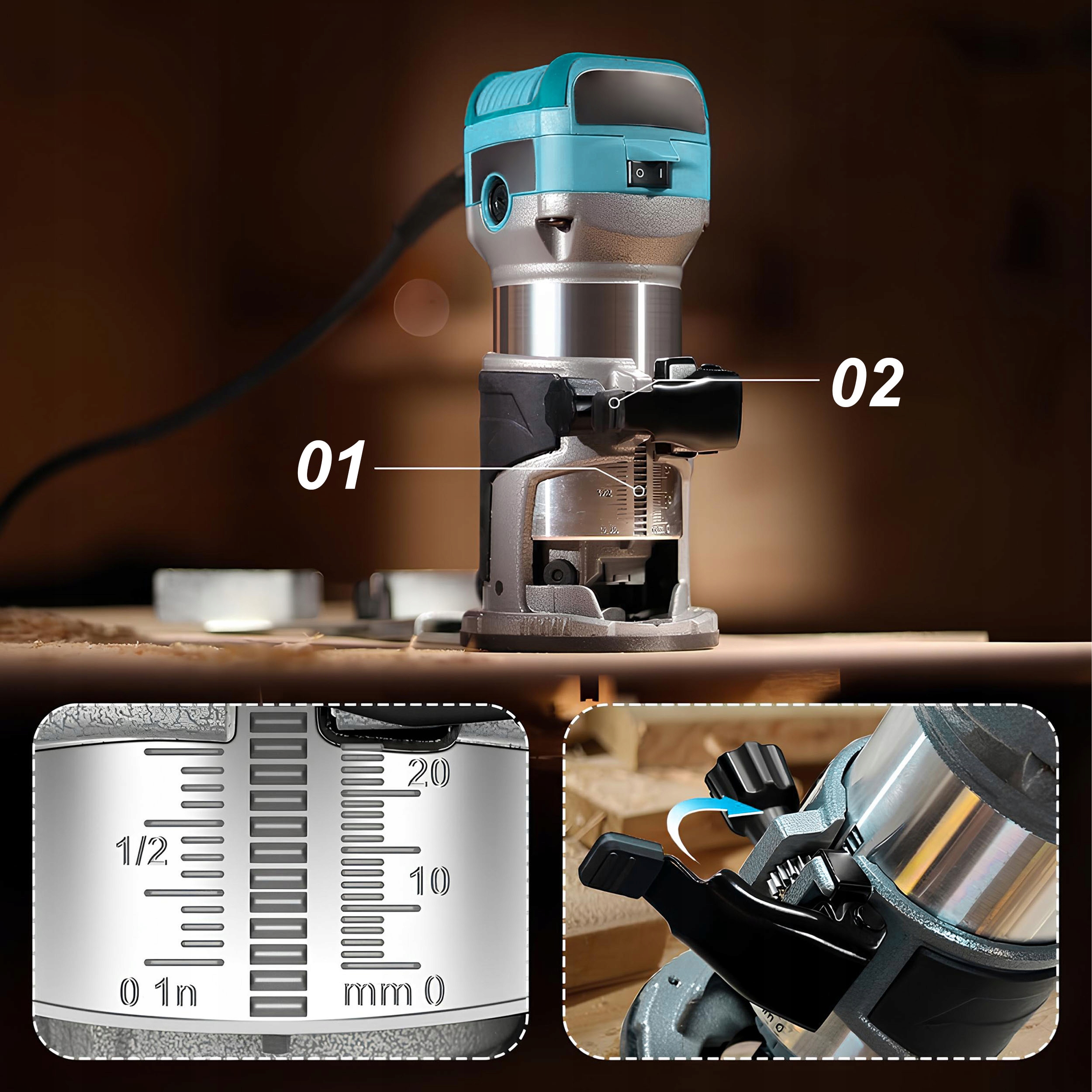 Ta rezkalnik omogoča natančno in ponovljivo rezkanje lesa, MDF-ja, vezanega lesa in mnogih drugih materialov. S širokim razponom hitrosti lahko orodje prilagodite vsaki nalogi – od občutljivih dekorjev do globokih utorov.
