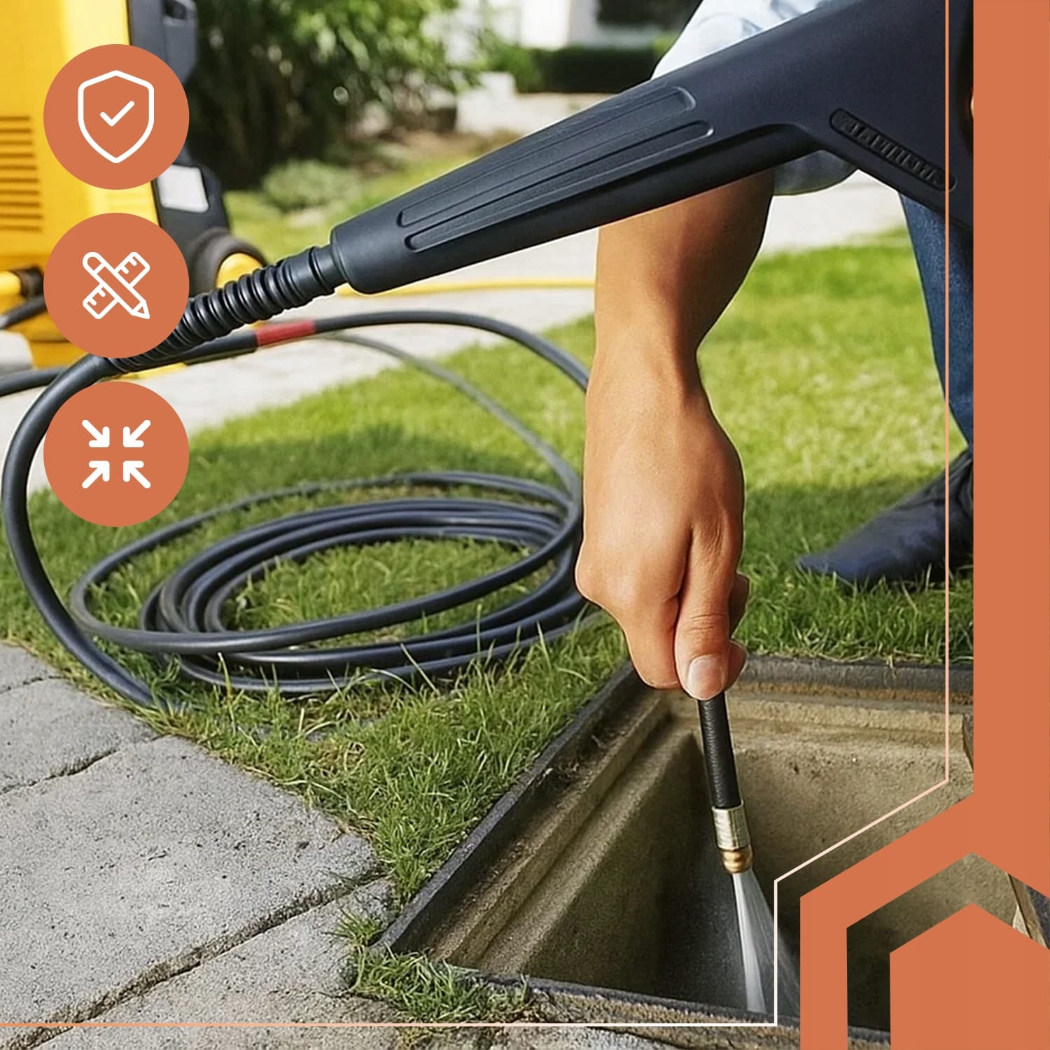 - Previdnost: Pred uporabo se prepričajte, da je odtočna cev, ki jo nameravate čistiti, primerna za visokotlačno čiščenje in da ni preveč stara ali poškodovana.