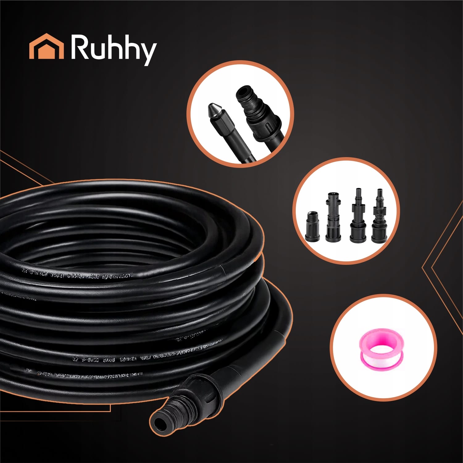 – komplet vsebuje 4 adapterje, ki omogočajo priklop cevi na različne modele visokotlačnih čistilcev – ne glede na to, kakšno opremo imate, bo RUHHY pripravljen na akcijo