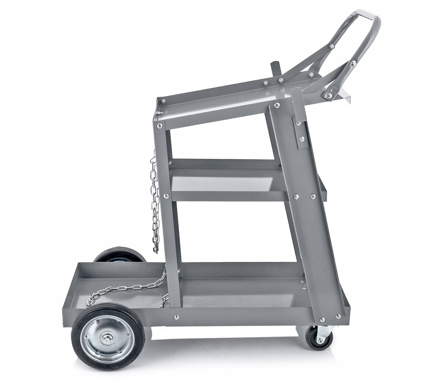 Zgornja polica za varilni stroj, drugi dve z veliko prostornino za pribor. Na zadnji strani vozička je polica za jeklenke skupaj z dvema verigama za stabilizacijo
